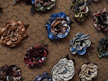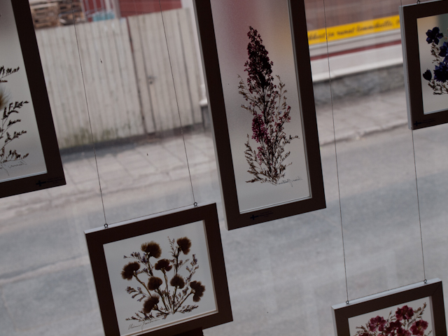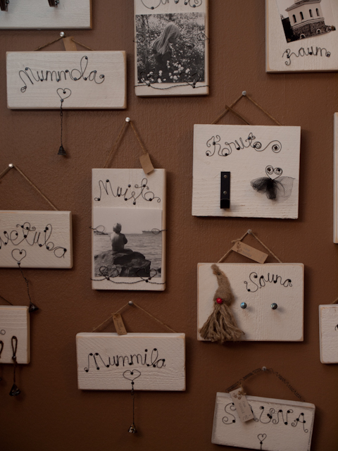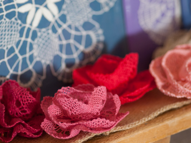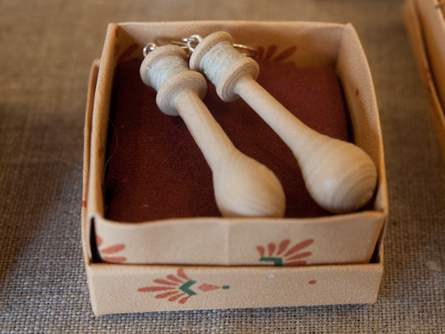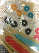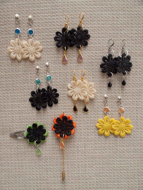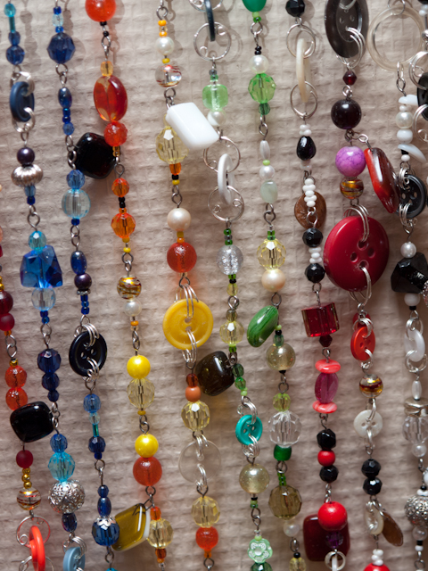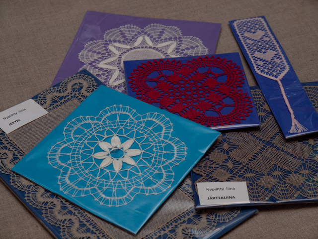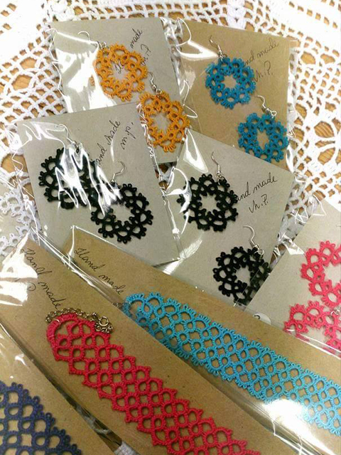 Myynnissä on paljon käsintehtyjä koruja ja koristeita. Materiaaleina on käytetty niin helmiä ja rautalankaa kuin pitsiä ja villaakin: